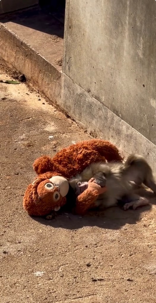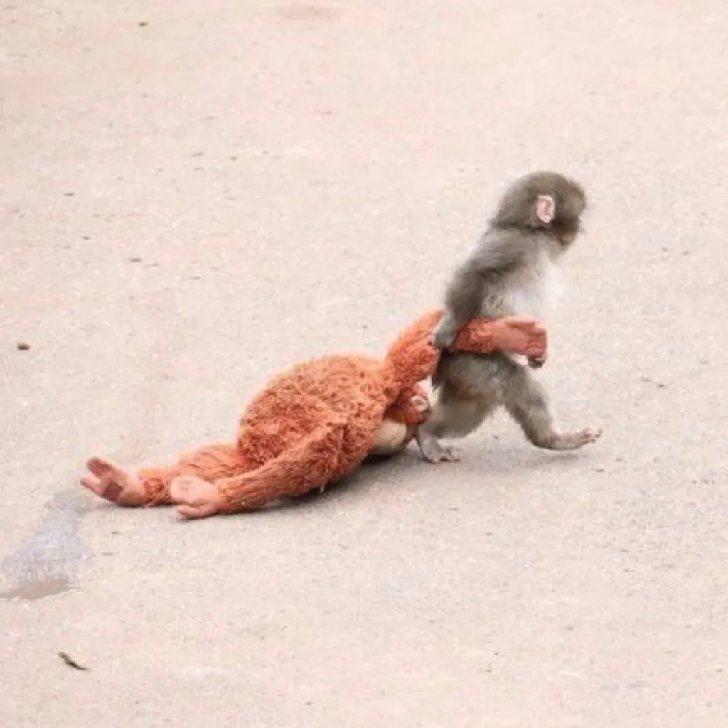 Un cucciolo rifiutato dalla mamma che si porta dietro un pupazzo per consolarsi.